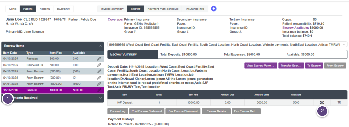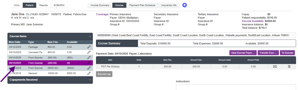 The money has been deducted from the patient’s escrow balance. The From Escrow item detail shows the Amount Paid to the payee.