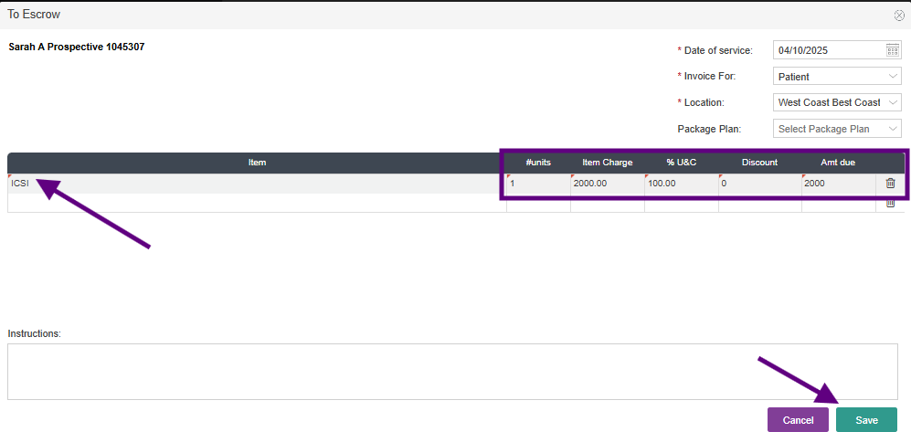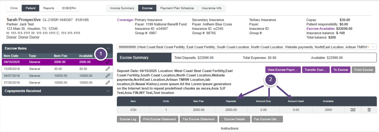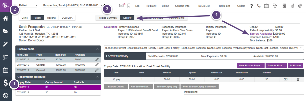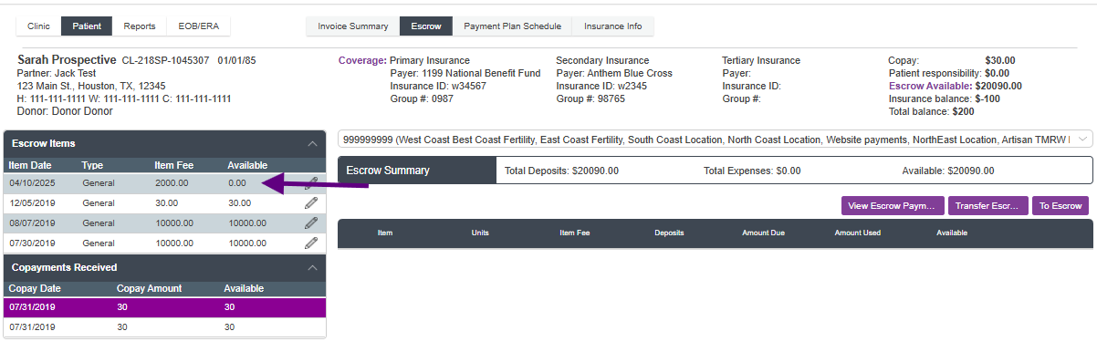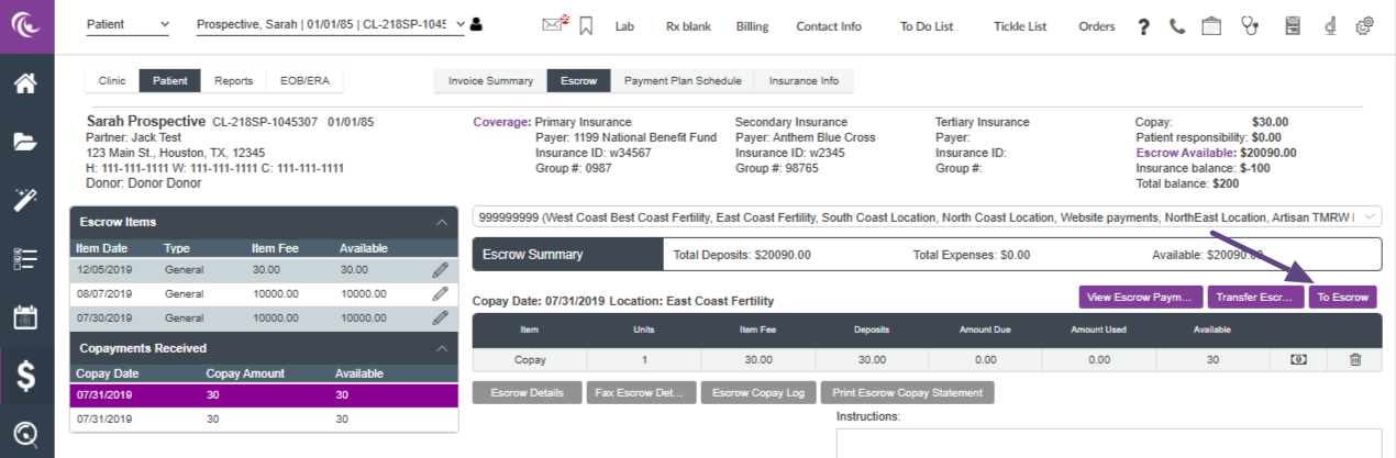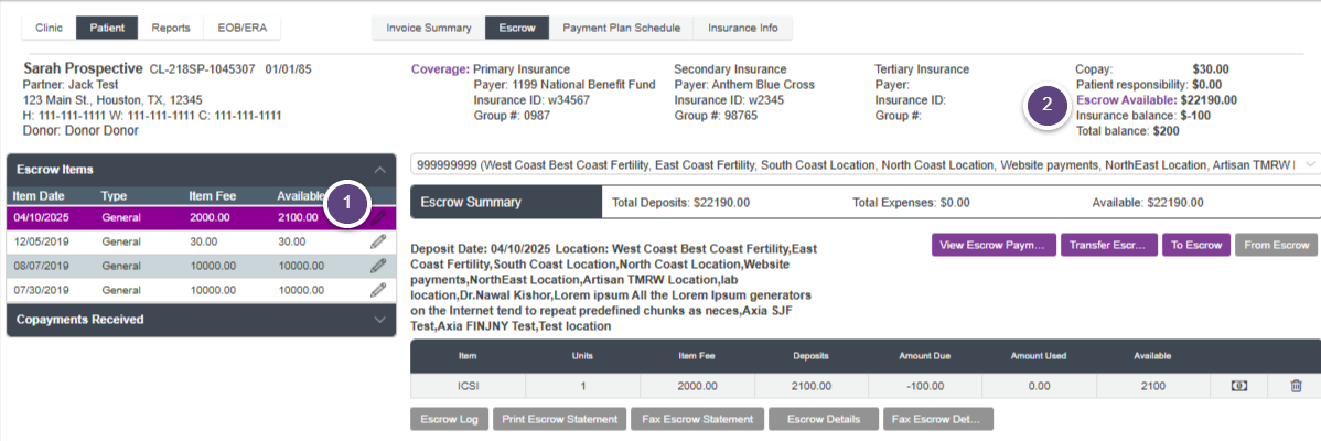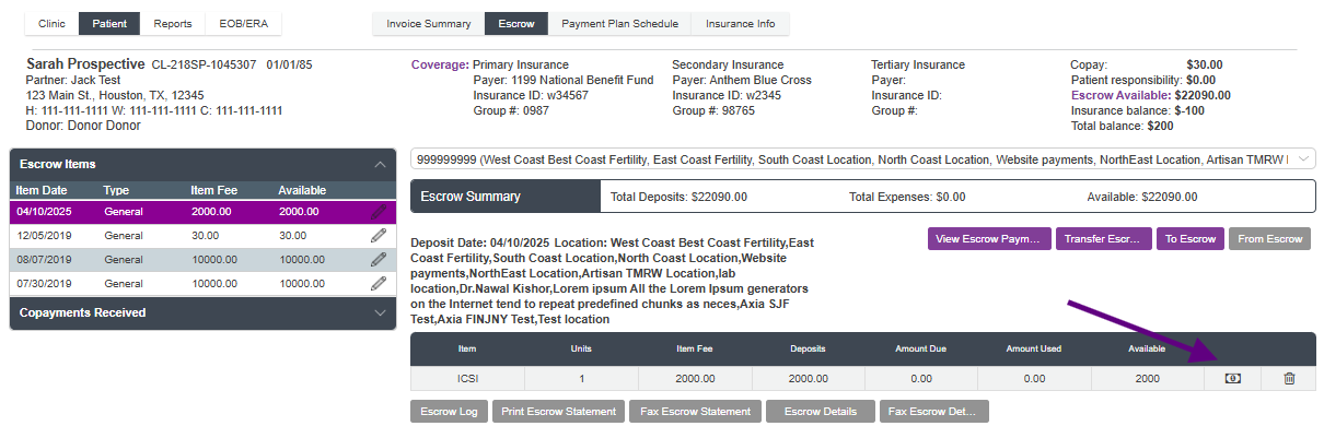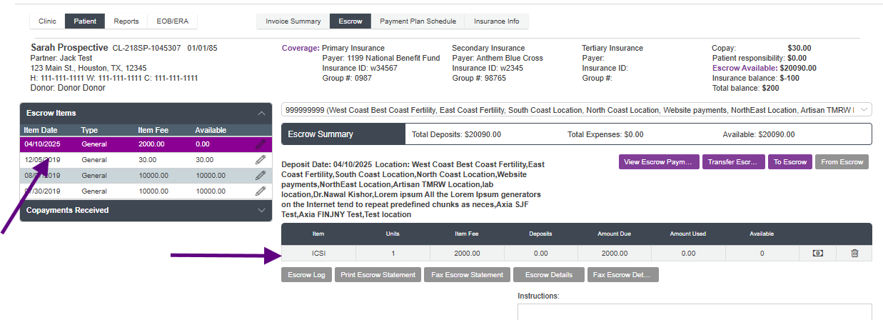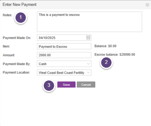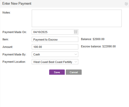 Escrow is a feature that allows you to enter money that a patient has paid for services that have not yet been rendered. For example, when a patient pre-pays for their IVF cycle, this money would go into their Escrow account, which will then be available to debit from as the patient accumulates charges.