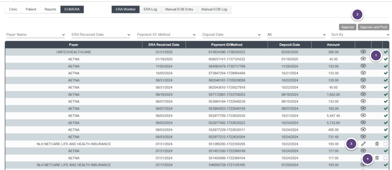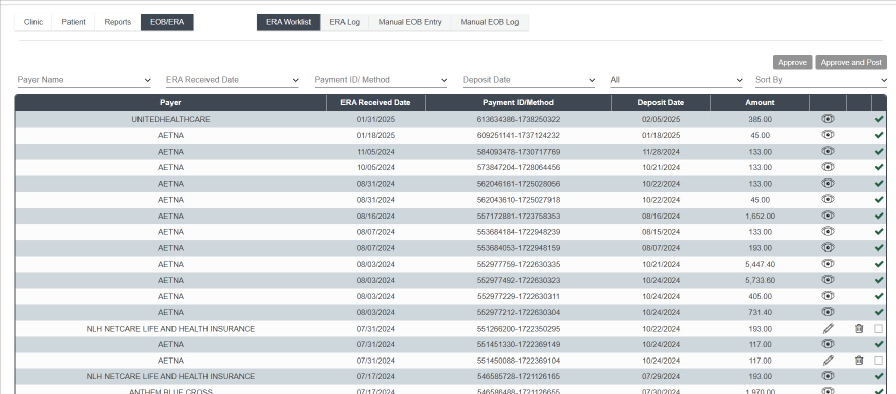 The checkboxes in the last column allow you to select various ERAs that have already been reviewed and approve or approve and post them in one action. Select the ERAs you want to bulk approve/approve and post.