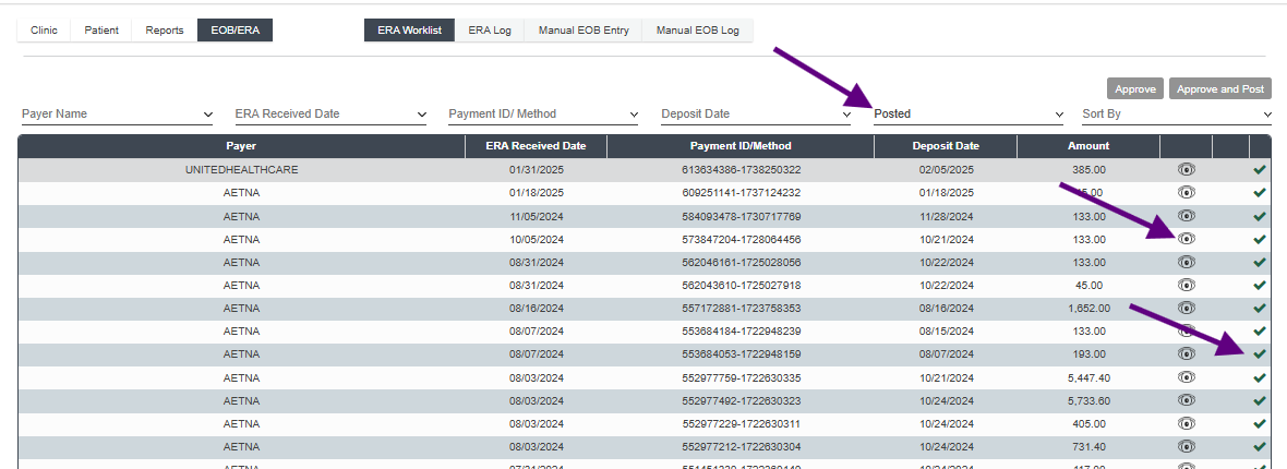 Once the ERA is posted, it will live under the POSTED status. Clicking on the eyeball icon will allow you to view the ERA, but you will not be able to make any further changes. The green checkmark indicates that the ERA was posted.