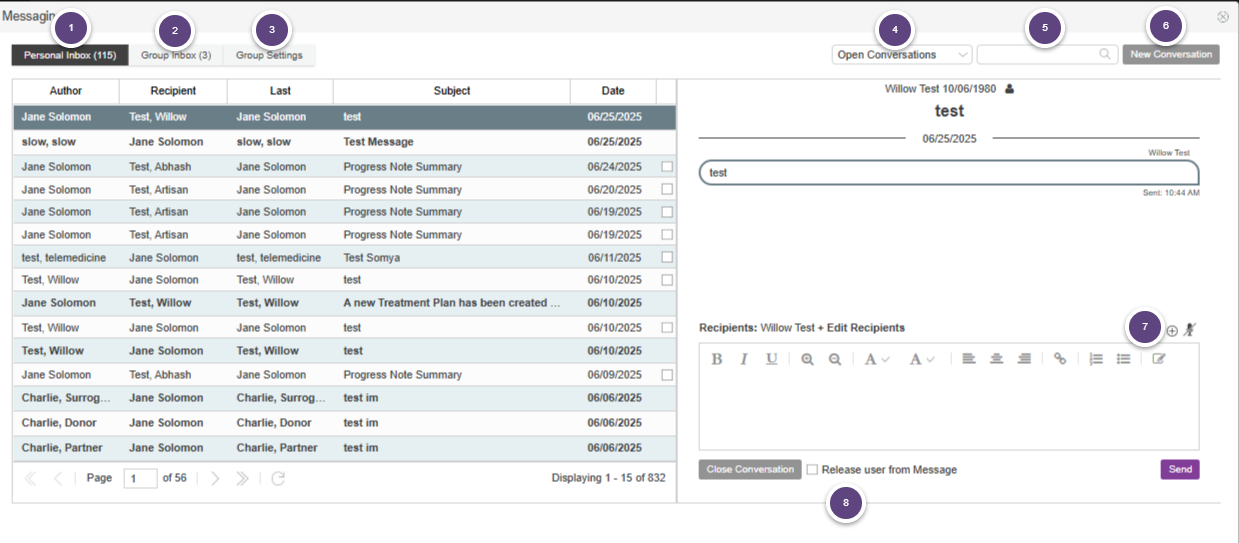 1. Personal Inbox - displays messages sent and received from the Patient, Partner, Donor, Surrogate, and Staff.