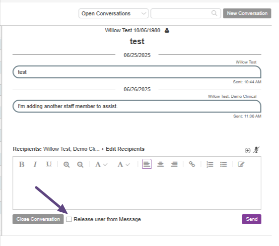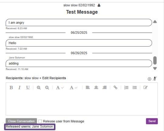 The message thread will list any users that have released themselves below the Close Conversation button.
